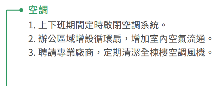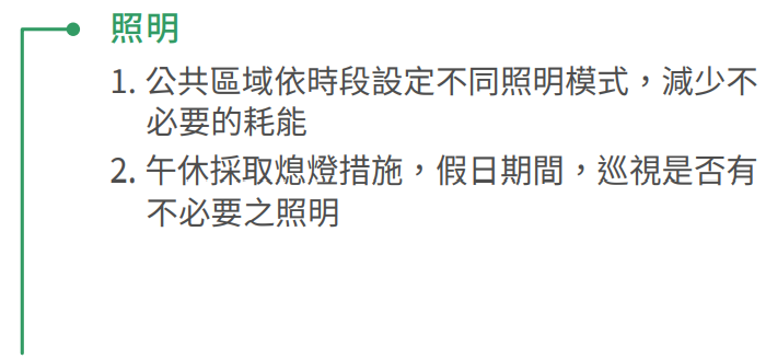 台灣保全用電情境多為一般辦公場所為主,能耗多以空調設備、照明設備為大宗,台灣保全為響應國際環境趨勢,持續推動各項辦公室節能活動減少能耗,透過公司同仁一同配合參與,達到最大化節能成效。