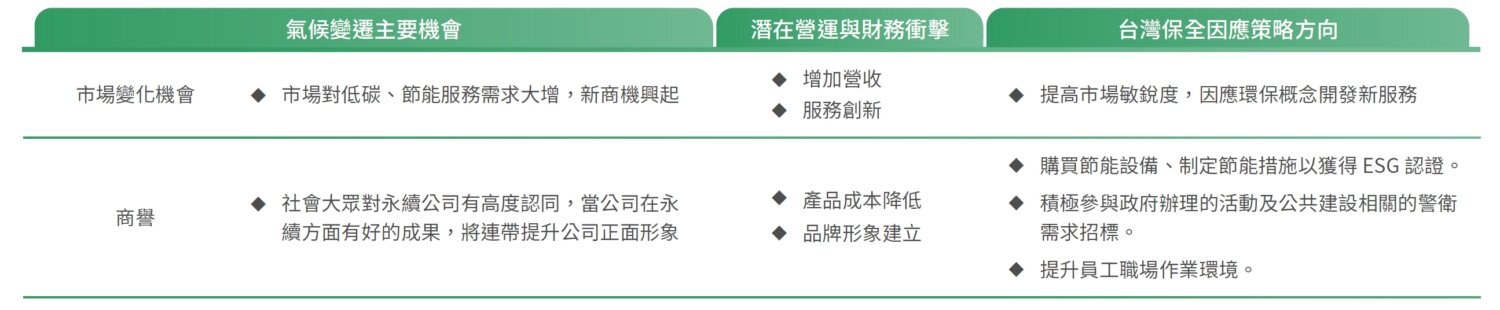 依台灣保全經由各業務單位參與討論辨識,評估氣候變遷相關項目對公司營運衝擊及相關因應措施如下: