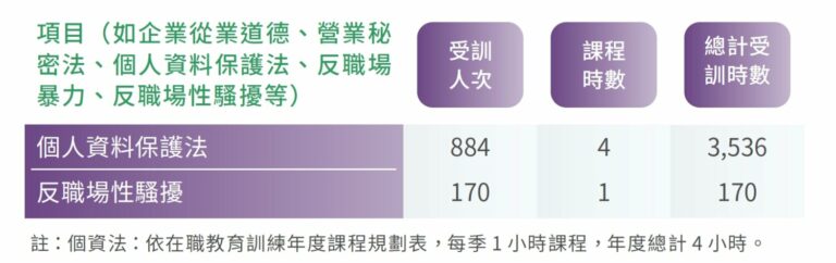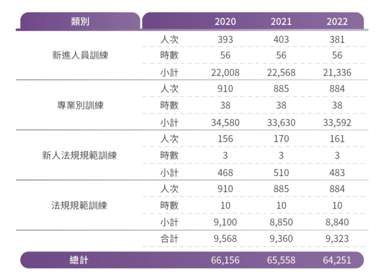 台灣保全屬於人力密集產業型態,因此對於人才培育與發展一向不遺餘力,相當重視經驗與知識的傳承,本公司致力提供員工一個開放多元的學習環境,除為新進人員及現有同仁規劃完善培訓體系,持續提升個人專業職能,使員工獲得最大的滿足外,對在職員工也規劃不同的進修課程,透過各項資源的整合與運用落實人才發展及教育訓練,使員工每年得以獲得不同的進修時數,提升自我價值。