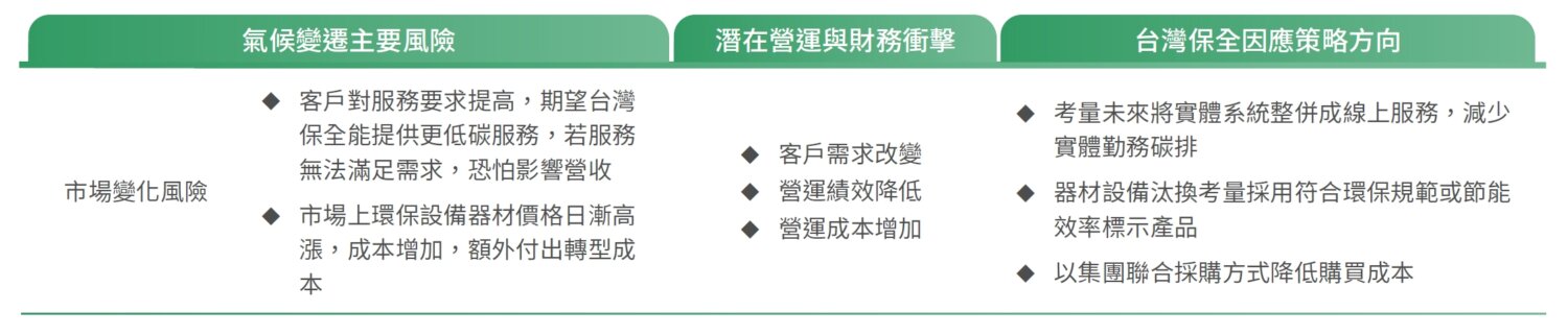 台灣保全為有效管理氣候風險及降低營運過程中可能對環境造成的影響,未來將有計畫持續降低碳排放,透過節能方案、設備汰換、綠色採購方式來達成目標設定。