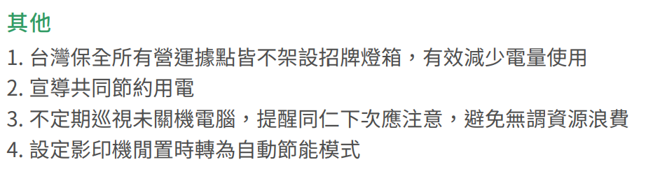 台灣保全用電情境多為一般辦公場所為主,能耗多以空調設備、照明設備為大宗,台灣保全為響應國際環境趨勢,持續推動各項辦公室節能活動減少能耗,透過公司同仁一同配合參與,達到最大化節能成效。