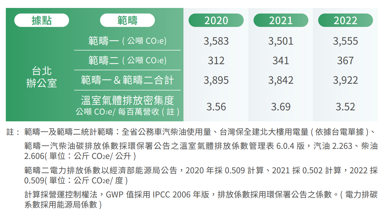考量企業要能永續發展,其中一環節,就必須關注身處之土地,珍惜周遭環境,台灣保全承諾要成為永續企業,我們有責任在環保議題上做出貢獻。依據產業特性,台灣保全主要能源使用可分辦公室區域用電以及公務車汽柴油使用,透過用電度數統計以及汽柴油使用量換算碳排,來作為溫室氣體排放量之依據。