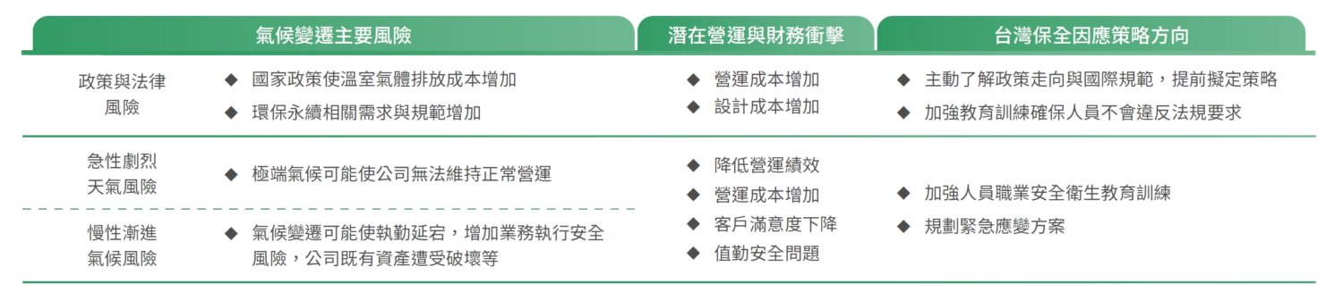 依台灣保全經由各業務單位參與討論辨識,評估氣候變遷相關項目對公司營運衝擊及相關因應措施如下: