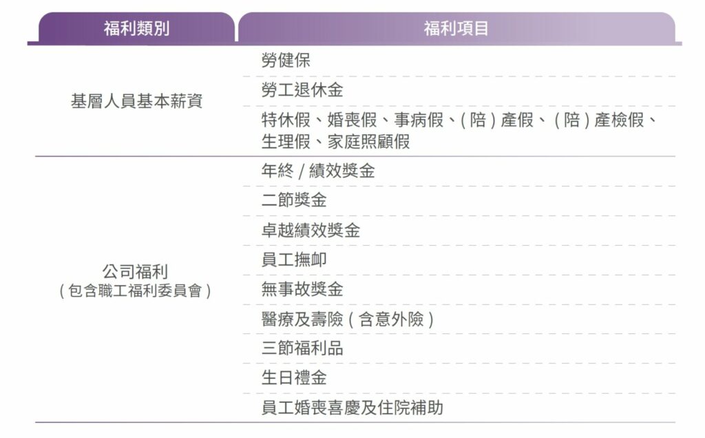 提供員工幸福友善的工作環境並且照顧與關懷員工身心健康與生活品質是台灣保全責無旁貸的責任,同時認同員工福利一直是企業管理中不可或缺的一部分,為提高員工的生活品質、滿足員工需求而提供的一系列福利措施。台灣保全訂定多項的員工福利措施,目的在於使員工在工作職場與生活休閒間取得平衡並全方位發展。故除法定福利外,台灣保全在員工福利政策上訂定多項滿足員工身、心靈以及健康照護等相關福利政策。