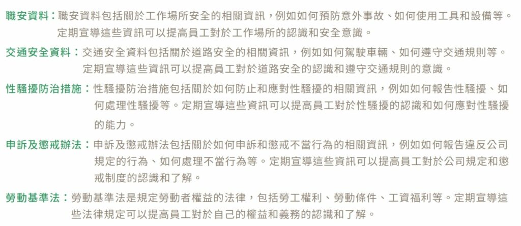 台灣保全將宣導工安資料、交通安全資料、性騷擾防治措施、申訴及懲戒辦法、勞動基準法等相關規範視為相當重要的課題,藉以不斷不定期的宣導方式,保障員工的權益和安全。包含: